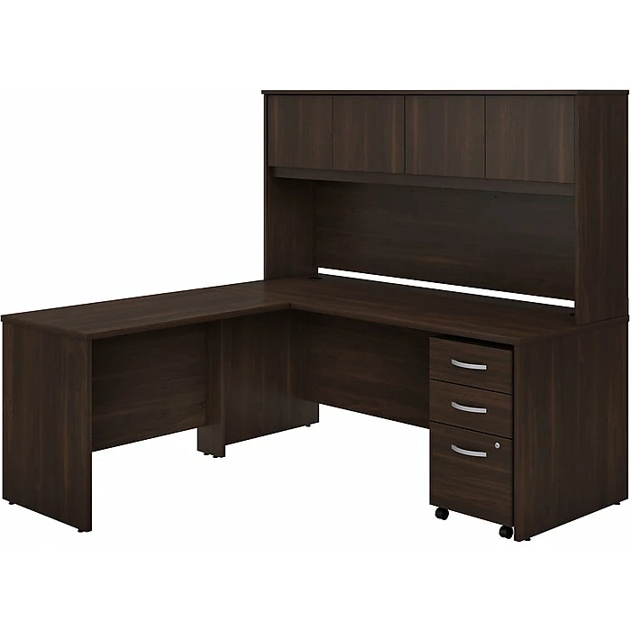 Choose this Bush Business Furniture Studio C L-shaped desk with a hutch and mobile file cabinet for a comfortable design that works with you for years. The thermally fused laminate finish, durable edge banding, and sturdy end panels resist scratches, stains and dents while standing up to the rigors of a 40-plus hour work week. The return attaches to either side of the desk to form a left- or right-handed L-shaped layout. With four doors featuring self-closing Euro-style hinges, the hutch conveniently stores office supplies, books, and more. The three-drawer file cabinet rolls throughout your office or remains in place as needed on any surface. One file drawer accepts legal, letter and A4-size paperwork, while two box drawers organize supplies. This desk with storage set comes with a 10-year warranty and meets ANSI/BIFMA quality test standards. American made with U.S. and imported parts.