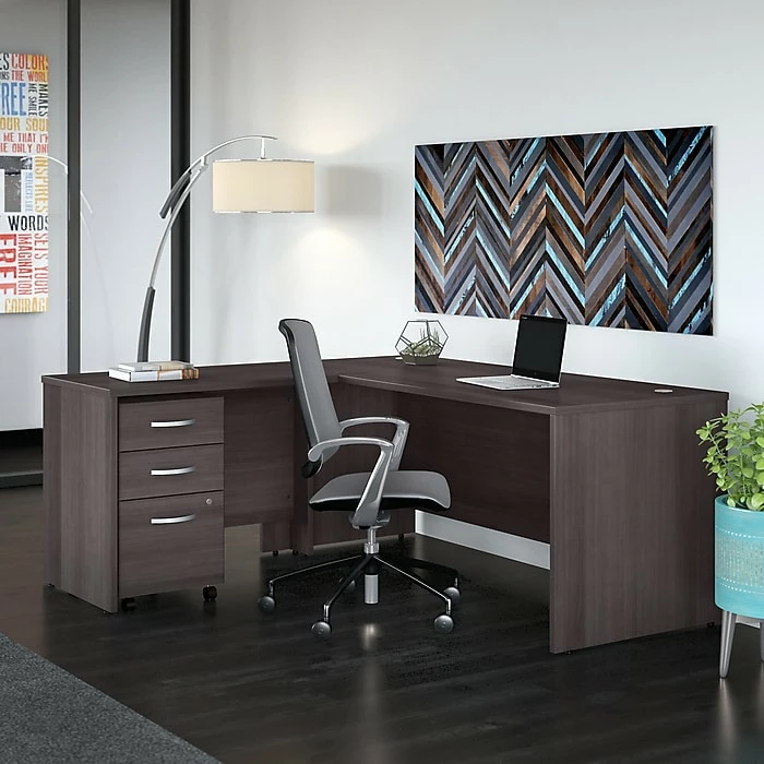 Choose this Bush Business Furniture Studio C L Shaped Desk for a comfortable design that works with you for years and a fresh finish that looks great anywhere. With a thick surface, an extended modesty panel and clean lines, the L Shaped Desk conveys a classic look but adds a contemporary White or Storm Gray finish to meet the style needs of the modern workspace. The thermally fused laminate finish, durable edge banding and sturdy end panels resist scratches, stains or dents while standing up to the rigors of a 40-plus hour work week. Keep pesky computer cords out of your way with the cable management system for an organized work surface. The 42W Return attaches to either side of the Desk to form a left or right handed L Shaped layout, while the 3 Drawer Mobile File Cabinet rolls with you throughout your office or remains in place as needed on any surface. This contemporary office furniture comes with a 10 Year Warranty and meets ANSI/BIFMA quality test standards. American made with U.S. and imported parts.