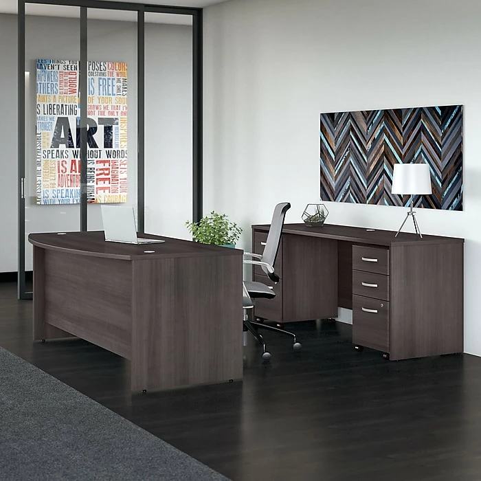 Give your office the quality you need and the style you deserve with the Bush Business Furniture Studio C 72W Bow Front Desk. The extended surface offers extra space to spread out with a computer and more while giving guests a rounded front to pull up a chair and collaborate. With a thermally fused laminate finish, the Bow Front Desk stands up to years of everyday use. The popular, classic office desk design receives a contemporary update with trendy White and Storm Gray finish options to fit seamlessly in a private office or as part of a larger environment. Keep pesky computer cords out of your way with the cable management system for an organized work surface. Combine the Bow Front Desk with matching products and accessories from the Studio C collection to create a unique office fit for the way you work. This contemporary office furniture comes with a 10 Year Warranty and meets ANSI/BIFMA quality test standards for performance and safety. See the full collection for coordinating items available to make your office your own with Studio C. American made with U.S. and imported parts.