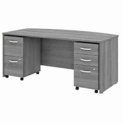 - Bundle includes: 71″W bow front desk, two-drawer mobile file cabinet, and three-drawer mobile file cabinet