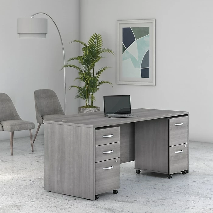 The Bush Business Furniture Studio C bow front desk and mobile file cabinets bring contemporary looks and complete functionality to the modern office. Give your office the workspace you need and the style you deserve with the Bush Business Furniture Studio C 71″W bow front desk and mobile file cabinets. The extended bow front desk surface offers extra space to spread out with a computer and more while giving guests a rounded front to pull up a chair and collaborate. With a durable thermally fused laminate finish, this office furniture set stands up to years of everyday use. Keep pesky computer cords out of your way with the cable management system for an organized work surface while storing your paperwork in the lockable mobile file cabinets. Full-extension file drawers with smooth ball bearing slides accept letter-, legal-, and A4-size documents. This desk with storage set comes with a 10-year manufacturer limited warranty and meets ANSI/BIFMA quality test standards for performance and safety. American-made with US and imported parts.