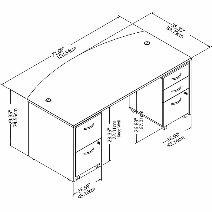| Included With Bundle | Bundle includes: 71″W bow front desk, two-drawer mobile file cabinet, and three-drawer mobile file cabinet |
