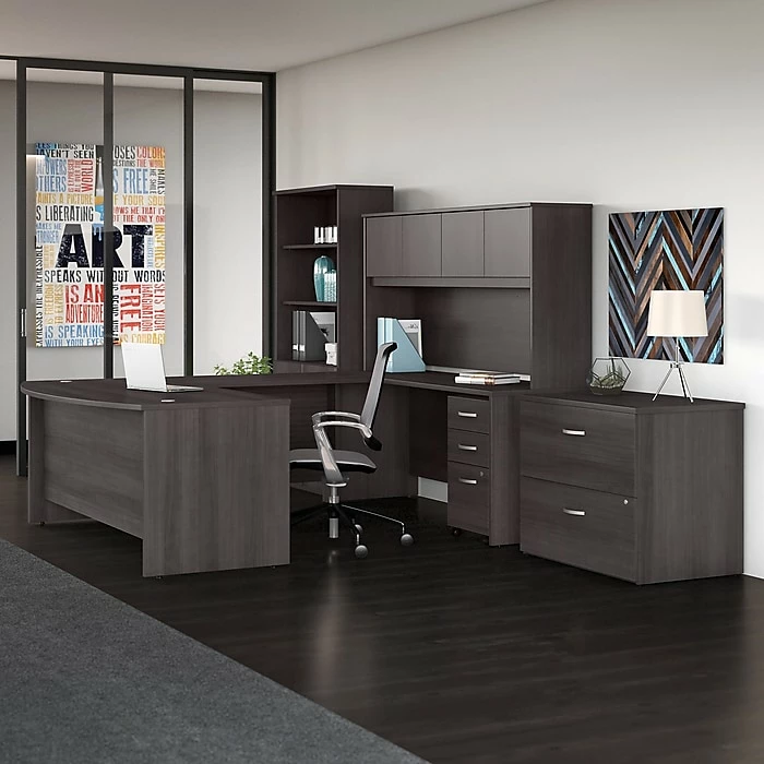 Give your office the workspace you need and the style you deserve with this Bush Business Furniture Studio C U Shaped Desk, Hutch, Bookcase and File Cabinets. The extended surface of the 72W x 36D Bow Front Desk offers guests a rounded front to pull up a chair and collaborate, while the expansive U shaped configuration has all the room you could ever want to spread out and multitask. With a thermally fused laminate finish, this office set stands up to years of everyday use. Keep pesky computer cords out of your way with a cable management system for a neat work surface. With 4 doors featuring self-closing Euro-style hinges, the Hutch conveniently stores office supplies, books and more. The 5 Shelf Bookcase with Doors mixes open and concealed storage, providing flexibility with 3 adjustable shelves. The 3 Drawer Mobile File Cabinet rolls with you throughout your office or remains in place as needed on any surface. Featuring 2 full-extension drawers opening on smooth ball bearing slides, the Lateral File Cabinet organizes your letter, legal and A4-size documents. The popular, classic office furniture design receives a contemporary update with trendy White and Storm Gray finish options to fit seamlessly in a private office or as part of a larger environment. This office set comes with a 10 Year Warranty and meets ANSI/BIFMA quality test standards for performance and safety. American made with U.S. and imported parts.