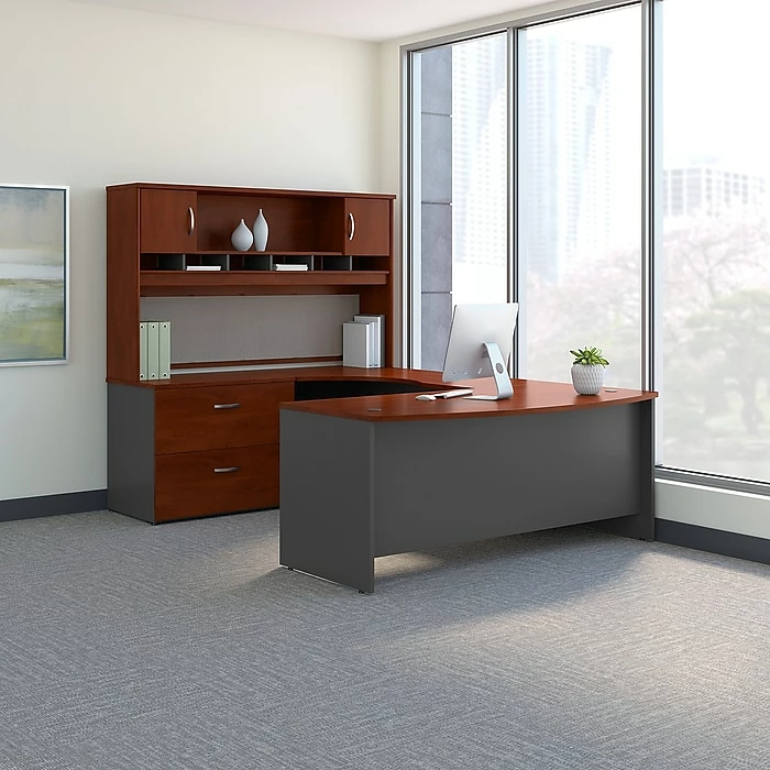 Outfit your office with the impressive style, spacious surfaces and professional quality of this Bush Business Furniture Westfield U Shaped Desk. Constructed with a durable thermally fused laminate finish and thick end panels to fend off damage, the Left Handed Desk provides plenty of room for productivity and multitasking. The inviting Bow Front design allows guests to pull up chairs and take notes. Brushed Nickel hardware and extended modesty panels create a classic look. Feed computer cables through wire management grommets for an organized work surface, and store paperwork in the Lateral File Cabinet. The Hutch has an open center section, 6 cubby shelves, 2 doors and a fabric tack board to keep everything you need nearby. Westfield offers endless layout options, expansion opportunities and 7 finishes. Backed by a 10 Year Warranty. American made with U.S. and imported parts.