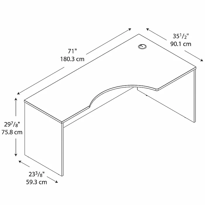 Roomy, comfortable and commercial-grade. The Bush Business Furniture Westfield 72W Right Handed Corner Desk provides a lasting professional appearance with clean lines, an extended modesty panel and heavy-duty construction. A comfortable, curved design invites you to lean in and get to work, while a thermally fused laminate finish fends off scratches and stains. Thick end panels and rugged edge banding ensure continued commercial quality. Spread out with paperwork and devices on the spacious surface while concealing cables in an integrated wire management grommet. Use the Right Handed Desk on its own or attach to matching Westfield products to create L or U Shaped configurations. Add a Hutch, Keyboard Tray or Monitor Arm (all sold separately) to complete your office. Backed by a 10 Year Warranty. American made with U.S. and imported parts.