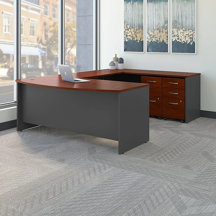 Sophisticated and spacious, this Bush Business Furniture Westfield U Shaped Desk brings commercial-quality features and durability to the workplace. The expansive wraparound U Shaped Desk includes all the room a busy professional needs to spread out for years of productivity. An inviting Bow Front design offers an extended surface for guests to pull up chairs and collaborate, while integrated wire management controls your electronics cables for a tidy workspace. The thermally fused laminate surface and sturdy construction combine with Brushed Nickel hardware and extended modesty panels for a lasting professional appearance you’ll love. The Mobile File Cabinets lock for your security and feature 3 full-extension file drawers and 2 box drawers combined. Westfield offers endless layout options and 7 finishes. Backed by a 10 Year Warranty. American made with U.S. and imported parts.