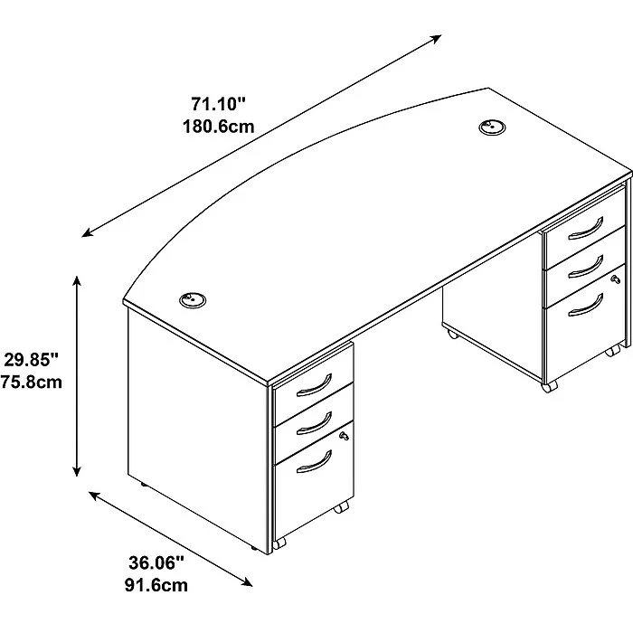 Uncomplicated, solid workspace with the Bush Business Furniture Westfield 72W Bowfront Shell Desk and two 3-Drawer Mobile Pedestals. The 72W Bowfront Shell Desk features a durable Thermally Fused Laminate top with high resistance to scratches and stains. An integrated wire management system provides easy concealment of cables and wires through desktop and leg grommets. The Mobile Pedestal units feature a combined four box drawers and two full-extension lockable file drawers to allow full access to letter, legal and A4 size files. Solid construction meets ANSI/BIFMA test standards in place at time of manufacture, this product is backed by a 10 Year Warranty. American made with U.S. and imported parts.