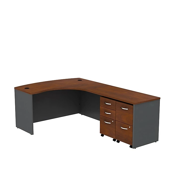 Sleek lines loaded with storage, the Bush Business Furniture Westfield 60W x 43D L-Bow Desk Shell and 48W Return Bridge partner with two Mobile Pedestal units to provide an expansive work space with style. The 2-Drawer Mobile Pedestal offers two file drawers, and the 3-Drawer unit features two box drawers and one file drawer. Each drawer opens on a full-extension ball bearing slide to allow access to the entire drawer, and hold letter, legal, and A4 size files. The oversize work surface boasts a durable Thermally Fused Laminate finish that resists scratches and stains to maintain its good looks, while the desktop is kept free from cords with the integrated wire management system using grommets in the desktop. This product is solidly constructed, meets ANSI/BIFMA test standards and is backed by 10 Year Warranty. American made with U.S. and imported parts.