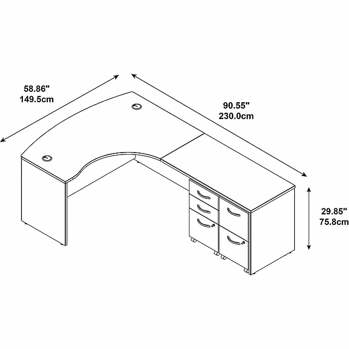 - Bundle Includes: 60W x 43D Right Hand L-Bowfront Desk, 48W Return Bridge, 3-Drawer Mobile Pedestal, and 2-Drawer Mobile Pedestal