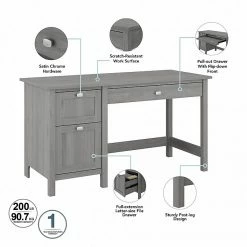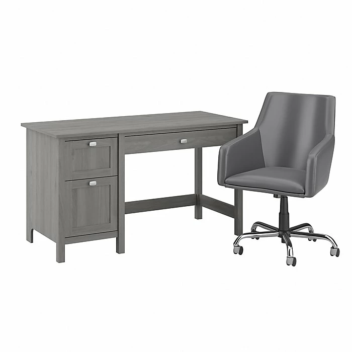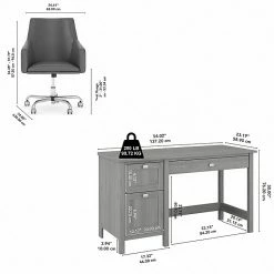 The Bush Furniture Broadview computer desk and mid-back leather box chair mixes fashion and function for a home office solution with long-lasting appeal. The 54″W x 23″D desktop offers plenty of room for materials while you take on your next big project or assignment. A pullout drawer with flip down front makes a perfect keyboard tray and can also be used to hold a laptop or tablet. Organize mail and other letter-size paperwork in a file drawer that opens on smooth ball bearing slides, and use the box drawer to keep supplies and utensils easily accessible. Foam cushioning gives the box chair a medium-firm feel while the curved backrest wraps around the body and tapers at the sides to support the arms. The desk chair’s height and tilt tension can be adjusted to meet your own preferences.
