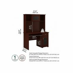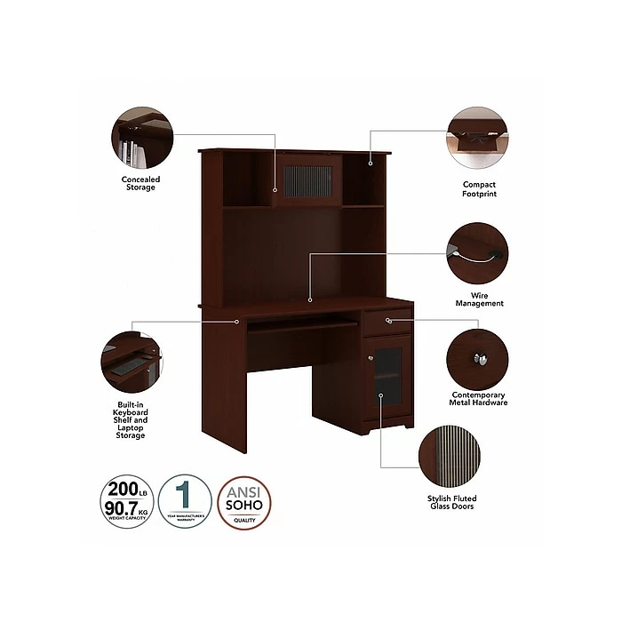 The Bush Furniture Cabot 48″W small computer desk with hutch presents a perfect home office solution for working in compact areas. Set up with your computer and all the materials you need to stay productive on a desktop that supports up to 200 lbs. The work surface also includes a built-in wire management grommet to keep pesky cords and cables out of the way while a pullout shelf conveniently stores your keyboard or laptop. Stash writing utensils, notepads, and other office supplies in the small desk’s box drawer and organize additional materials inside the lower storage cabinet. The desk hutch adds a center cabinet with a stylish fluted glass door in between two open compartments for flexible storage and display. This home office desk with storage has been tested to meet ANSI/SOHO standards for safety and performance and is backed by a 1-year manufacturer limited warranty.