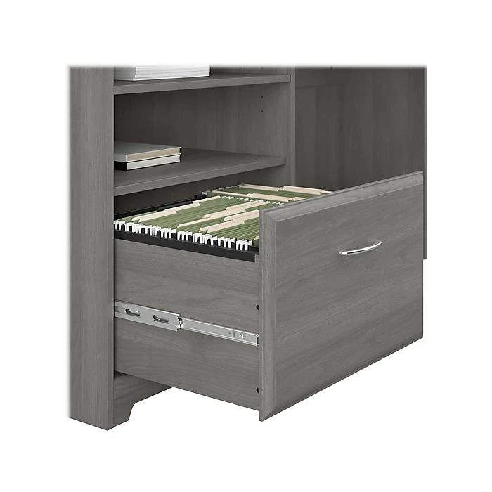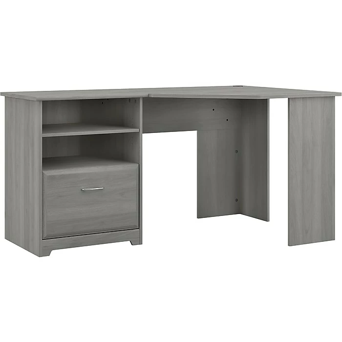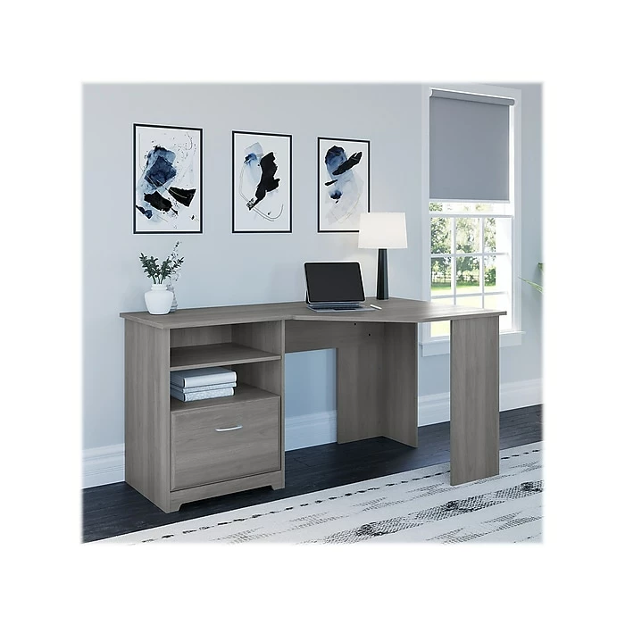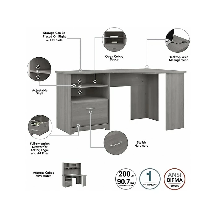 A timeless design with smart features and storage makes the Bush Furniture Cabot 60″W corner desk a great fit for any modern or traditional home office. The Bush Furniture Cabot 60W corner desk offers ample storage, technology integration, and plenty of workspace for a stylish addition to your home office. The corner computer desk’s storage can be placed on whichever side you prefer for a customizable configuration. The unique design saves space in compact areas while still providing a roomy work surface to spread out and be productive. A full-extension file drawer opens on smooth ball bearing slides for an effortless reach to letter-, legal-, and A4-size paperwork while an open cubby shelf works perfectly for storing books and more. Cable management grommets on the desktop let you easily hide unsightly cords. This home office desk with storage is tested to meet ANSI/BIFMA standards for safety and performance and is backed by the Bush Furniture 1-year manufacturer warranty.