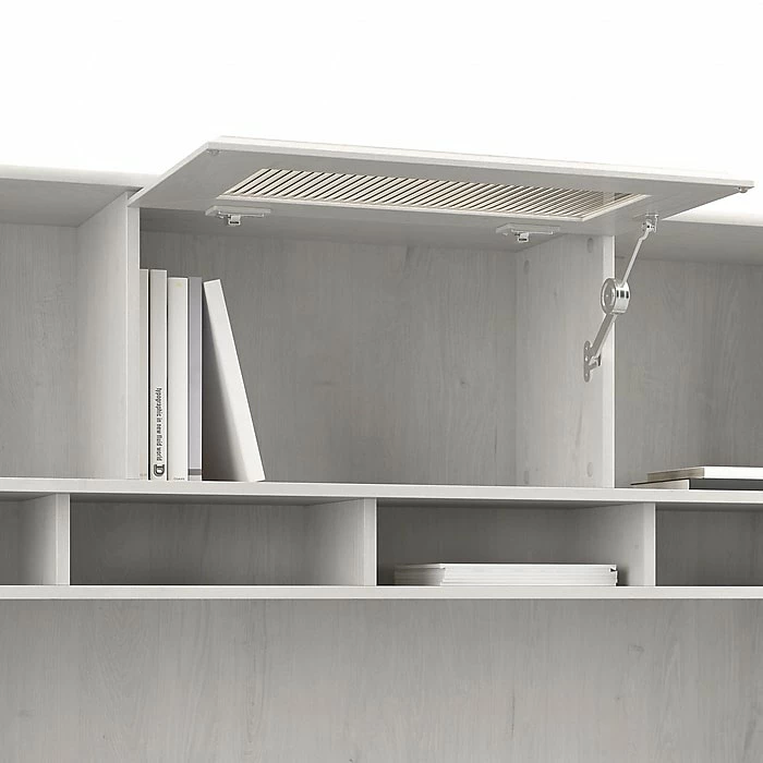 - Closed storage compartment on hutch with fluted glass door that flips up to open
