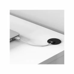 - Cable management grommets on the desk surface hide cords
