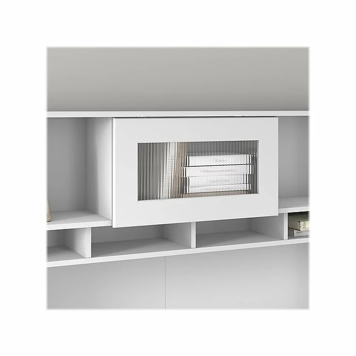 - Closed storage compartment on the hutch features a fluted-glass door that flips up to open