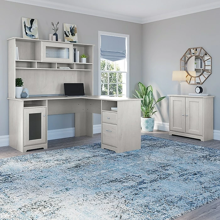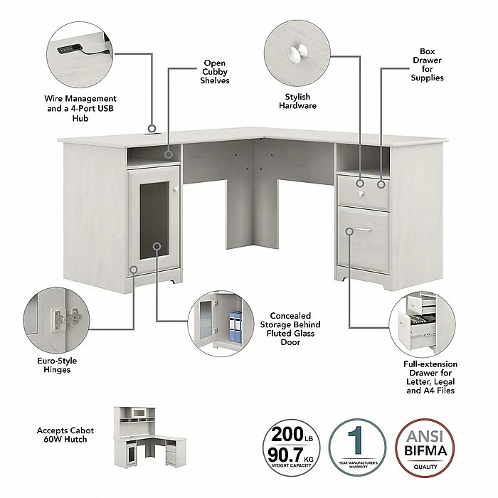 The stylish and functional Bush Furniture Cabot L-shaped desk with hutch and small storage cabinet offers a spacious work area for your home or office. Enjoy a beautiful traditional look with smart features. The L-shaped desk design provides a large, durable work surface and storage details, including an enclosed cabinet with a stylish fluted glass door, a box drawer for supplies, and a full-extension file drawer gliding on smooth ball bearing slides. Technology features such as a built-in four-port USB hub add convenience. The hutch boasts a matching fluted glass door, large open compartments, and four work-in-process areas. The small storage cabinet with doors offers a stylish approach to organizing books, personal items, or supplies. Keep everything in order and out of sight with an adjustable shelf to accommodate items of varying sizes. Meets ANSI/SOHO standards.