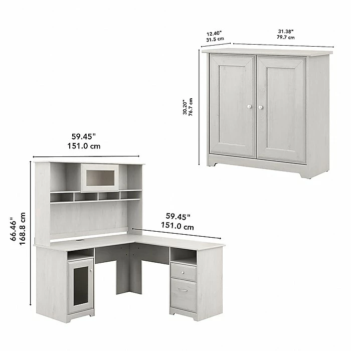 - Dimensions: 66.46″H x 59.45″W x 59.45″D (desk with hutch), 30.2″H x 31.38″W x 12.4″D (storage cabinet)