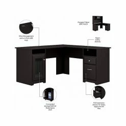 - Corner desk surface includes built-in wire management and a four-port USB hub for connecting electronic devices