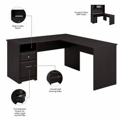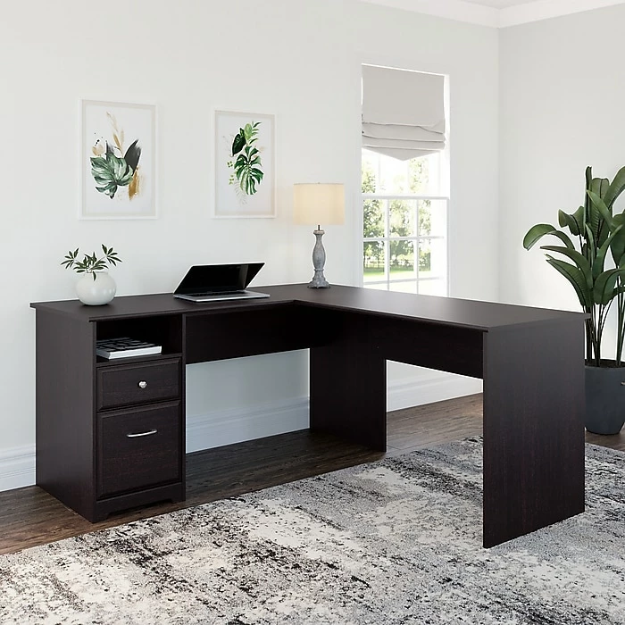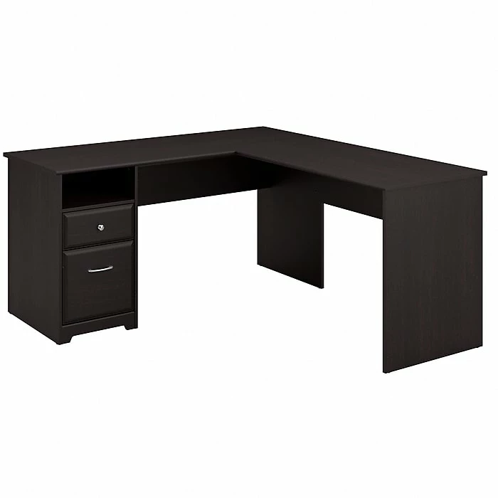 Create a stylish, functional and organized home office with the Bush Furniture Cabot 60W L Shaped Computer Desk with Drawers. The spacious work surface allows you to spread out with your laptop, papers, printer and more with room to spare. Store files and supplies in the included drawers and open cubby shelf, designed for quick and easy access. A smooth full-extension drawer opens effortlessly on reliable ball bearing slides so you’ll have no trouble reaching your letter or legal-size files. The space-saving desk design is ideal for placement in a corner. Backed by a Bush Furniture 1 Year Manufacturer’s Warranty, the L Shaped Computer Desk with Drawers meets ANSI/SOHO quality test standards for safety and performance.