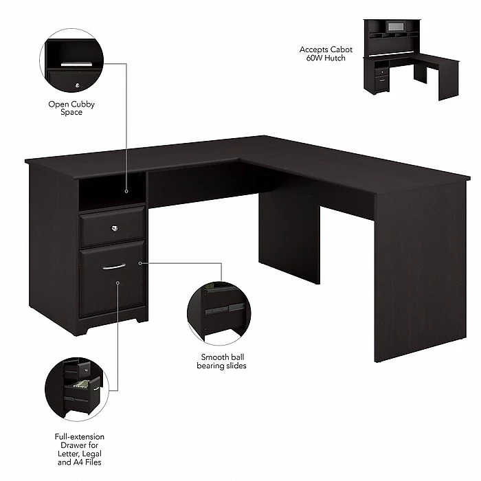 Create a stylish, functional and organized home office with the Bush Furniture Cabot 60W L Shaped Computer Desk with Hutch and Drawers. The spacious work surface allows you to spread out with your laptop, papers, printer and more with room to spare. Store files and supplies in the included drawers and open cubby shelf, designed for quick and easy access. A smooth full-extension drawer opens effortlessly on reliable ball bearing slides so you’ll have no trouble reaching your letter or legal-size files. The space-saving desk design is ideal for placement in a corner, while the Hutch offers an eye-catching flip-up door and includes open storage for books or decorations. Backed by a Bush Furniture 1 Year Manufacturer’s Warranty, the L Shaped Computer Desk with Hutch and Drawers meets ANSI/SOHO quality test standards for safety and performance.
