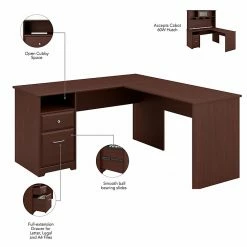 Create a stylish, functional and organized home office with the Bush Furniture Cabot 60W L Shaped Computer Desk with Hutch and Drawers. The spacious work surface allows you to spread out with your laptop, papers, printer and more with room to spare. Store files and supplies in the included drawers and open cubby shelf, designed for quick and easy access. A smooth full-extension drawer opens effortlessly on reliable ball bearing slides so you’ll have no trouble reaching your letter or legal-size files. The space-saving desk design is ideal for placement in a corner, while the Hutch offers an eye-catching flip-up door and includes open storage for books or decorations. Backed by a Bush Furniture 1 Year Manufacturer’s Warranty, the L Shaped Computer Desk with Hutch and Drawers meets ANSI/SOHO quality test standards for safety and performance.