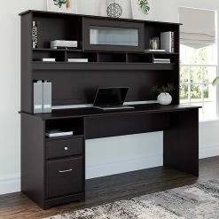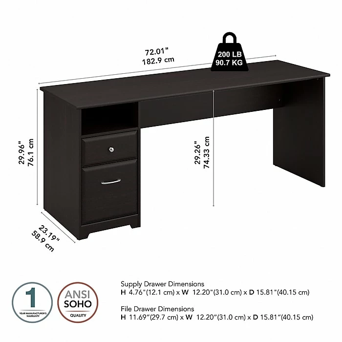 Create a stylish, functional and organized home office with the Bush Furniture Cabot 72W Computer Desk with Drawers. The spacious work surface allows you to spread out with your laptop, papers, printer and more with room to spare. Store files and supplies in the included drawers and open cubby shelf, designed for quick and easy access. A smooth full-extension drawer opens effortlessly on reliable ball bearing slides so you’ll have no trouble reaching your letter or legal-size files. Use the Computer Desk on its own or add a coordinating Return (sold separately) to create an L shaped layout. Backed by a Bush Furniture 1 Year Manufacturer’s Warranty, the Desk with Drawers meets ANSI/SOHO quality test standards for safety and performance.