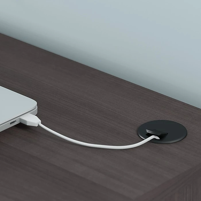 - The Harvest Cherry and Espresso Oak Desks contain a handy charging station; the Heather Gray Desk features a full shelf for paperwork and supplies