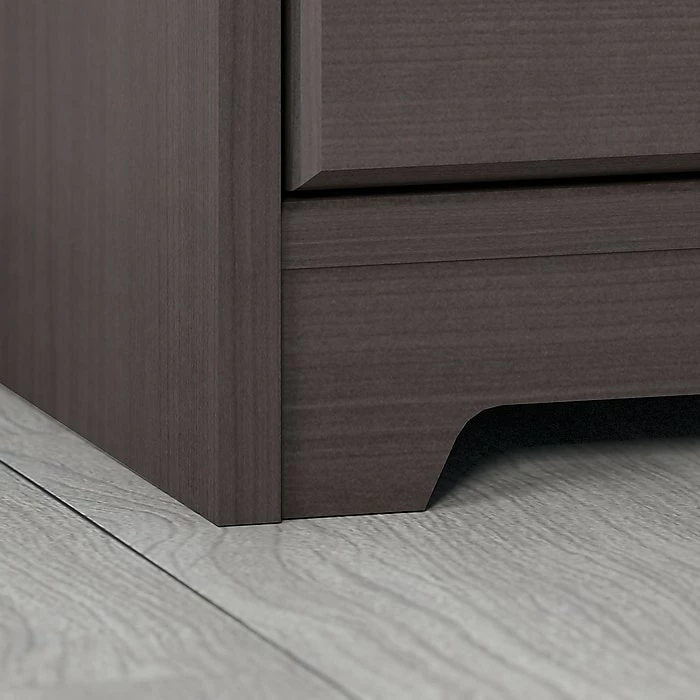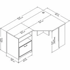The Bush Furniture Cabot Corner Desk offers ample storage, technology integration and plenty of workspace for a stylish addition to your home office. The customizable Corner Desk adjusts to fit your needs as the pedestal attaches to the left or right side for added comfort and convenience. Perfect for placement in a corner, the unique design saves space but still gives you a roomy work surface to spread out and be productive. A full-extension file drawer glides on smooth ball bearing slides for an easy reach to the back, while an open cubby shelf works perfectly for storing books and more. Cable management grommets on the Corner Desk surface let you easily hide unsightly cords, while Chrome-finished hardware provides a simple and timeless appearance you’ll love in your home or small office. See the full collection for coordinating items. Backed by a 1 Year Warranty.