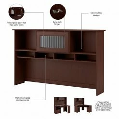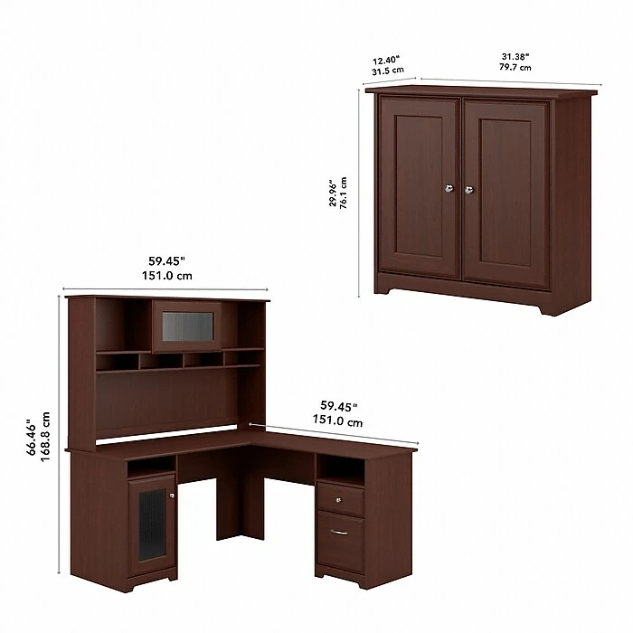 The stylish and functional Bush Furniture Cabot L Shaped Desk with Hutch and Small Storage Cabinet offers a spacious work area for your home or office. Enjoy a beautiful traditional look with smart features. The L Shaped Desk design provides a large durable work surface and storage details including an enclosed cabinet with stylish fluted glass door, a box drawer for supplies and a full-extension file drawer gliding on smooth ball bearing slides. Technology features such as a built-in 4-port USB hub add convenience. The Hutch boasts a matching fluted glass door, large open compartments and four work-in-process areas. The Small Storage Cabinet with Doors offers a stylish approach to organizing books, personal items or supplies. Keep everything in order and out of sight with an adjustable shelf to accommodate items of varying sizes. Backed by a 1 Year Warranty. Meets ANSI/SOHO standards.