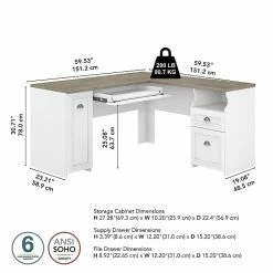 Bring a slice of modern farmhouse styling into your home office with the Bush Furniture Fairview L-shaped desk. Enjoy your morning coffee, surf the net, and pay bills with plenty of room to spare on the corner desk’s spacious and durable work surface. Stash pens, paper, and checkbooks in the box drawer and open cubby space while organizing mail in the letter-size file drawer. A drawer that features a convenient flip-down front makes an excellent keyboard tray or laptop storage shelf, so the desktop remains free for your daily tasks. The L-shaped desk’s vertical storage cabinet contains one adjustable shelf to accommodate office supplies and materials of various sizes. Charming accents and antique pewter hardware add plenty of character to your home office. This farmhouse desk with storage is tested to meet ANSI/SOHO quality standards for safety and performance.