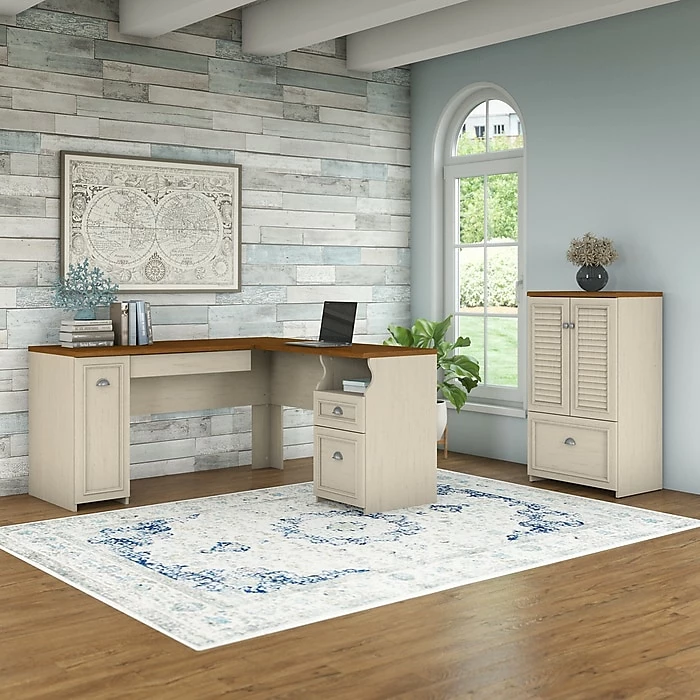 Allow your home or office to take on the welcoming charm of modern farmhouse styling with the Bush Furniture Fairview 60W L Shaped Desk and Storage Cabinet with Drawer. The design of the L Shaped Desk saves space while still providing a large enough surface to comfortably take on your daily tasks. A vertical storage compartment, box and file drawers, and an open cubby area offers plenty of organization capability in addition to a convenient drop down front drawer that can easily store a laptop or keyboard. The Storage Cabinet’s louvered doors conceal two adjustable shelves for flexible organization while a file drawer opening on smooth ball bearing slides makes accessing letter and legal size documents a breeze. This white office furniture set is tested to meet ANSI/SOHO standards for safety and performance and is backed by the Bush Furniture 6 Year Manufacturer’s Warranty.