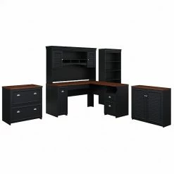 - Bundle includes: 60W L Shaped Desk, Hutch for L Shaped Desk, Small Storage Cabinet with Doors, 2 Drawer Lateral File Cabinet, 5 Shelf Bookcase