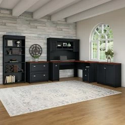 Bring the relaxed ambience of modern farmhouse styling to your home office with the Bush Furniture Fairview 60W L Shaped Desk with Hutch, 5 Shelf Bookcase, Lateral File Cabinet and Small Storage Cabinet with Doors. The design of the L Shaped Desk is perfect for maximizing the potential of a small space with its generous surface area, diverse storage features, and a Hutch that mounts to either side for a custom configuration. The Storage Cabinet has adjustable shelves that make it easy to store a variety of items, while the Lateral File Cabinet opens on ball bearing slides for convenient access to legal and letter sized files. The Bookcase also has three shelves that can be adjusted in addition to a pair of fixed shelves that add stability. All items are tested to meet ANSI/SOHO standards for safety and performance and are backed by the Bush Furniture 6 Year Manufacturer’s Warranty.