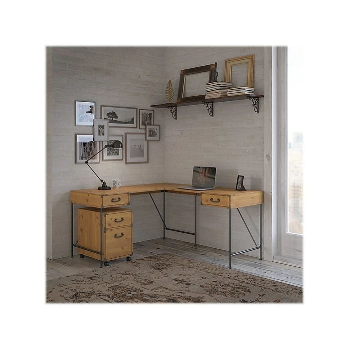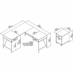 The Bush Furniture Ironworks 60″W L-shaped writing desk with two-drawer mobile file cabinet offers a workspace that celebrates the beauty of industrial design. The Bush Furniture Ironworks 60″W L-shaped writing desk with two-drawer mobile file cabinet provides plenty of room to spread out and includes ample storage so the materials you need are always within reach. The durable 60″W x 60″D work surface supports a computer, books and more with a weight capacity of 200 lbs. while two box drawers organize miscellaneous items. The filing cabinet features one drawer for legal, letter and A4-size documents and another for small office supplies. Lockable dual-wheeled casters offer flexible yet secure positioning anywhere in your home office, including underneath the L-shaped desk. This corner desk with storage set is tested to meet ANSI/SOHO quality standards for safety and performance and is backed by a 3-year manufacturer limited warranty.