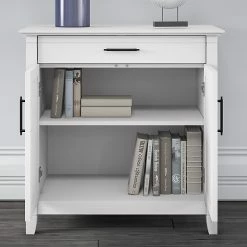 The Bush Furniture Key West secretary desk with storage and desktop organizers provides a compact personal workspace with casual farmhouse style. Use the compact Bush Furniture Key West secretary desk with storage and desktop organizers to create a functional home office in any sized space. This 30″W x 20″D x 30″H small computer desk serves as a central location for your laptop and offers a casual storage solution that works subtly in any room. The convenient top drawer opens on smooth full-extension ball bearing slides and includes a flip-down front that folds up neatly when not in use. The built-in storage cabinet features one adjustable shelf to help you organize work materials and supplies of various sizes. The desk organizers add two drawers for small office supplies along with horizontal and vertical shelves for sorting mail, memos and work in progress. This laptop storage credenza with organization is tested to meet ANSI/SOHO quality standards for safety and performance and is backed by a 1-year manufacturer’s warranty.
