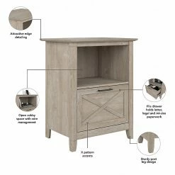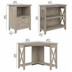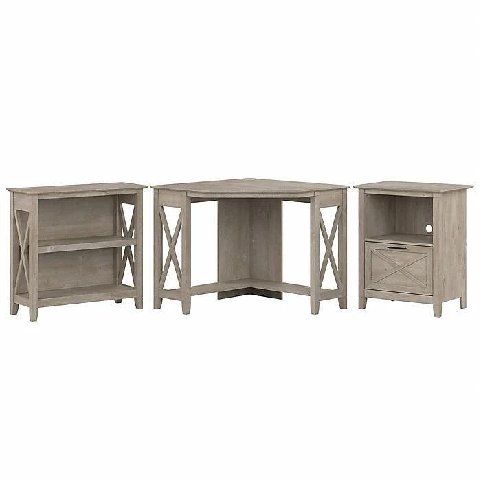 The Bush Furniture Key West small corner desk with two-shelf bookcase and lateral file cabinet offers a compact workspace solution that brings a touch of casual style to your home office. Perfect for those with limited space, this corner computer desk provides enough room to take on your next project or assignment without the need for a large dedicated work area. The desktop supports up to 200 lbs. and has a built-in wire management grommet to keep cords out of the way. Use the single-drawer file cabinet with shelf to organize letter-, legal-, and A4-size paperwork while stashing materials and supplies in the upper compartment. The low bookcase includes one fixed shelf and one adjustable shelf to accommodate books and decorations of various sizes. This home office desk with storage has been tested to meet ANSI/SOHO standards for safety and performance and is backed by 1-year warranty.