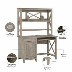The Bush Furniture Key West 48″W small computer desk with hutch offers a compact workspace solution that brings casual style to your home office. Spread out on a durable desktop that supports up to 200 lbs. and has built-in wire management to keep cords out of the way. A convenient pullout shelf, small box drawer, and vertical storage cabinet help maintain a clutter-free workspace. Take advantage of the hutch’s three open compartments to store books, or give your home office a personal touch with pictures and decorations. Organize letter-, legal-, and A4-size paperwork inside the two-drawer lateral file cabinet. The bookcase features three adjustable shelves for flexible storage and display, along with two fixed shelves for stability. This home office desk with bookshelf and file cabinet has been tested to meet ANSI/SOHO standards for safety and performance and is backed by 1-year warranty.