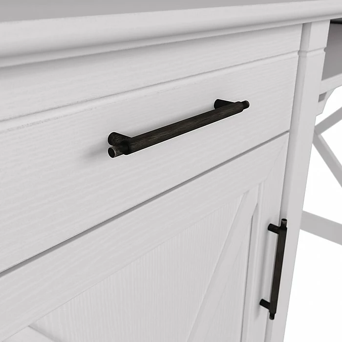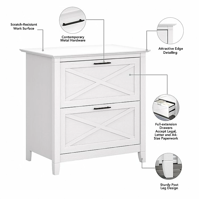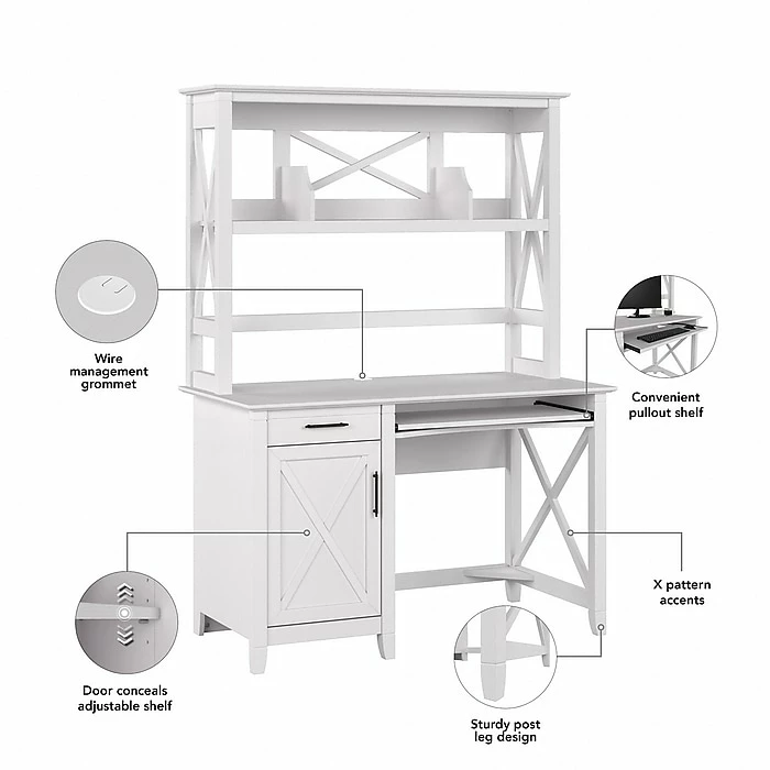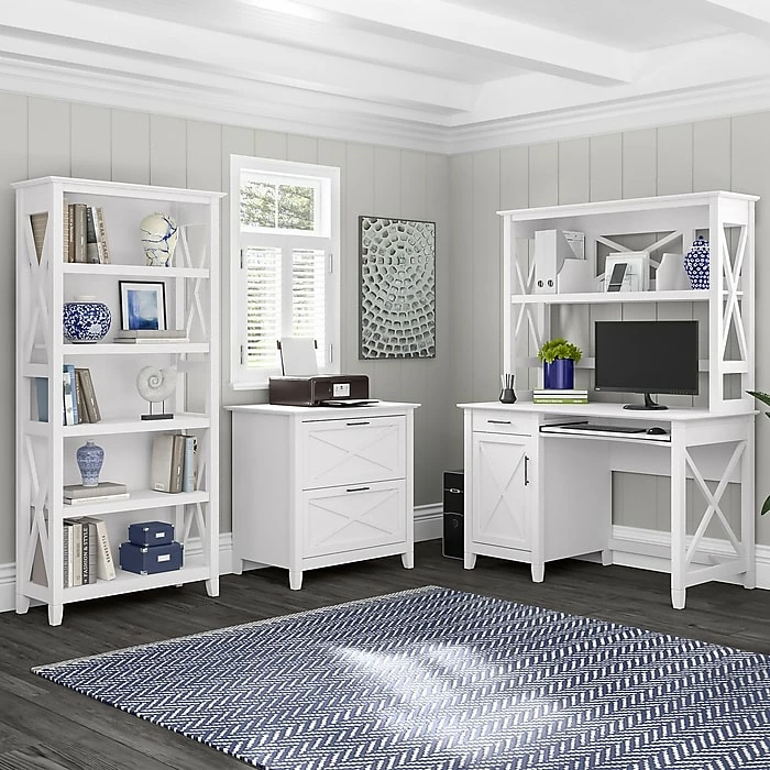 The Bush Furniture Key West 48″W small computer desk with hutch offers a compact workspace solution that brings casual style to your home office. Spread out on a durable desktop that supports up to 200 lbs. and has built-in wire management to keep cords out of the way. A convenient pullout shelf, small box drawer, and vertical storage cabinet help maintain a clutter-free workspace. Take advantage of the hutch’s three open compartments to store books, or give your home office a personal touch with pictures and decorations. Organize letter-, legal-, and A4-size paperwork inside the two-drawer lateral file cabinet. The bookcase features three adjustable shelves for flexible storage and display, along with two fixed shelves for stability. This home office desk with bookshelf and file cabinet has been tested to meet ANSI/SOHO standards for safety and performance and is backed by 1-year warranty.