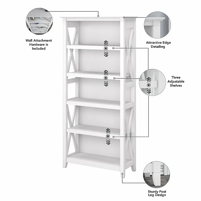 - Tall bookcase has two fixed shelves and three adjustable shelves for flexible storage and display; each shelf supports up to 50 lbs.