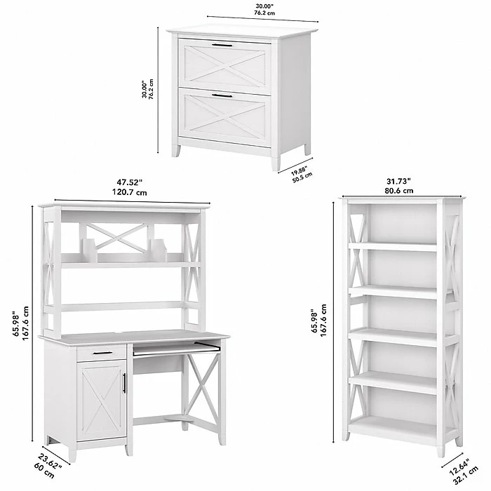 - Dimensions: 66″H x 48″W x 24″D (desk with hutch); 66″H x 32″W x 13″D (bookcase); 30″H x 30″W x 20″D (file cabinet)