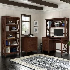 The Bush Furniture Key West 48″W small computer desk with hutch offers a compact workspace solution that brings casual style to your home office. Spread out with a computer, books, paperwork, and more on a durable desktop that supports up to 200 lbs. The work surface also has a built-in wire management grommet to keep cords and cables out of the way. A pullout shelf provides easy access to your keyboard or laptop, while a small box drawer organizes writing utensils, notepads, and other office supplies. Larger materials can be stashed inside the vertical storage cabinet to maintain a clutter-free work area. Take advantage of the hutch’s three open compartments to store books, or give your workspace a personal touch with pictures and decorations. This home office desk with storage has been tested to meet ANSI/SOHO standards for safety and performance and is backed by a 1-year warranty.