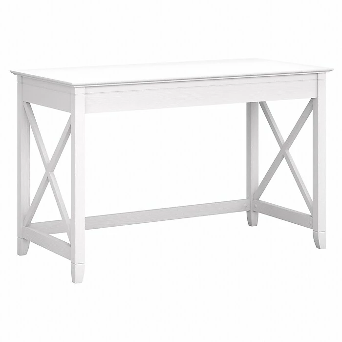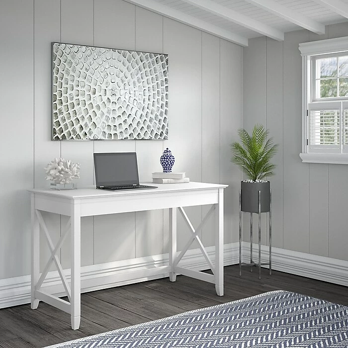 The Bush Furniture Key West 48″W writing desk features an easy-going style that makes it a perfect choice for your casual home office or living space. Take on your daily tasks from the comfort spacious personal work area, even in small office environments. The Bush Furniture Key West 48″W writing desk offers more than enough room to spread out with a laptop and paperwork as you surf the web, pay bills, or check the mail. Featuring side panels with unique X pattern accents, this office desk creates a relaxed and airy style supported by a sturdy and attractive post leg design. The durable work surface has a weight capacity of 200 lbs., so you can confidently keep books and other work materials close by. Measuring 30″H x 48″W x 24″D, the writing desk is perfect for use as a sofa table, console table, or personal work area and is finished on all sides to look great facing any direction. This small computer desk is tested to meet ANSI/SOHO quality standards for safety and performance and is backed by the Bush Furniture 1-year warranty.