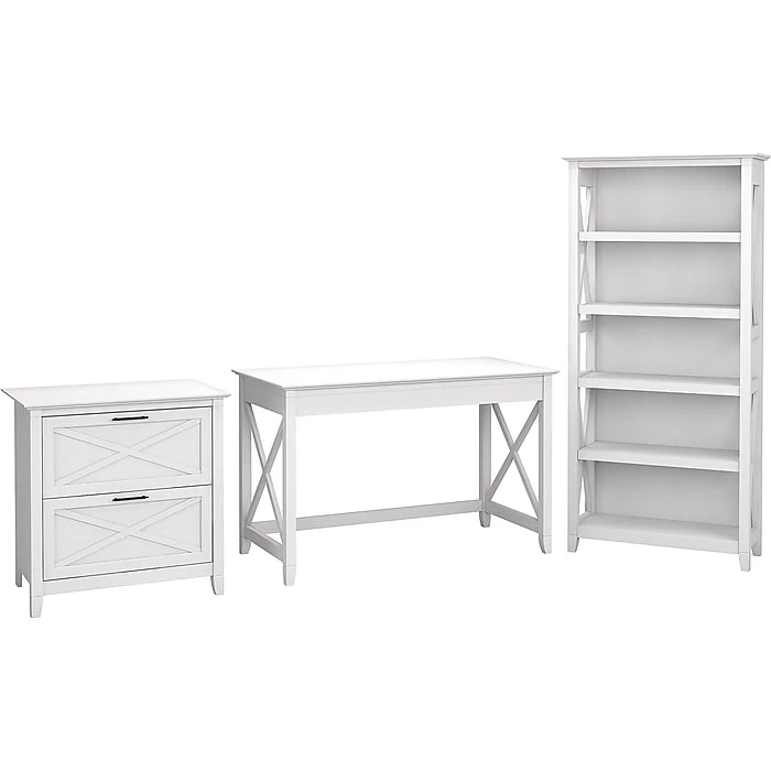 - Bundle includes: 48″W writing desk, two-drawer lateral file cabinet, and five-shelf bookcase