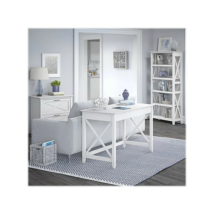 The Bush Furniture Key West 48″W writing desk with a lateral file cabinet and a five-shelf bookcase provides a home office furniture set with casual farmhouse style. A natural fit for homes that embrace coastal and farmhouse decor, the Bush Furniture Key West 48″W writing desk with a lateral file cabinet and a five-shelf bookcase creates a spacious feeling even in small areas. This 48″W x 24″D small computer desk provides plenty of room to spread out with a laptop and paperwork while boasting a weight capacity of 200 pounds. The lateral filing cabinet has two drawers that accept legal and letter-size documents and matches the desk’s height for an extended work surface when placed side by side. The bookshelf features three adjustable shelves and two fixed shelves for flexible storage and display. Each shelf supports up to 25 pounds so you can show off your favorite books and decorations with confidence. This small desk with storage set is tested to meet ANSI/SOHO quality standards for safety and performance and is backed by a 1-year manufacturer’s warranty.