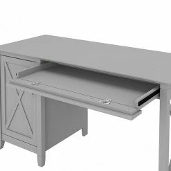 The Bush Furniture Key West 54″ computer desk with a two-drawer lateral file cabinet offers a refreshing approach to working in your home. Spread out with a computer, books, and paperwork on a durable 54″ x 24″ desktop that boasts a weight capacity of 200 lbs. The convenient top drawer is a perfect place to store your keyboard or laptop and has a flip-down front that folds up neatly when not in use. The desk also includes a built-in storage cabinet with one adjustable shelf to accommodate materials of various sizes. The lateral filing cabinet’s drawers open on smooth, full-extension ball-bearing slides for an easy reach to legal- and letter-size documents. Unique X-pattern accents create a relaxed feel with a sturdy and attractive post-leg design. This computer desk with storage and file cabinet set is tested to meet ANSI/SOHO quality standards for safety and performance and is backed by a 1-year warranty.