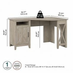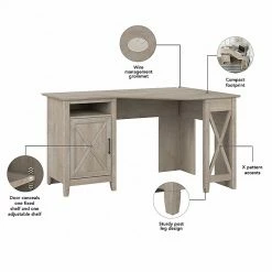 The Bush Furniture Key West 54″W corner computer desk with storage offers a practical workspace solution that brings a touch of casual style to your home office. Spread out with a computer, books, paperwork, and more on a durable desktop that supports up to 200 lbs. The corner desk’s work surface also includes a built-in wire management grommet to keep cords and cables out of the way. Keep important materials organized and accessible inside a vertical storage cabinet with one fixed shelf and one adjustable shelf. An open cubby space allows for easy access to work in progress, small office supplies, and other frequently used items. X-shaped accents convey a casual appearance that works well with cottage, coastal, and modern farmhouse style. This home office desk with storage has been tested to meet ANSI/SOHO standards for safety and performance and is backed by 1-year warranty.