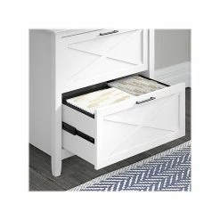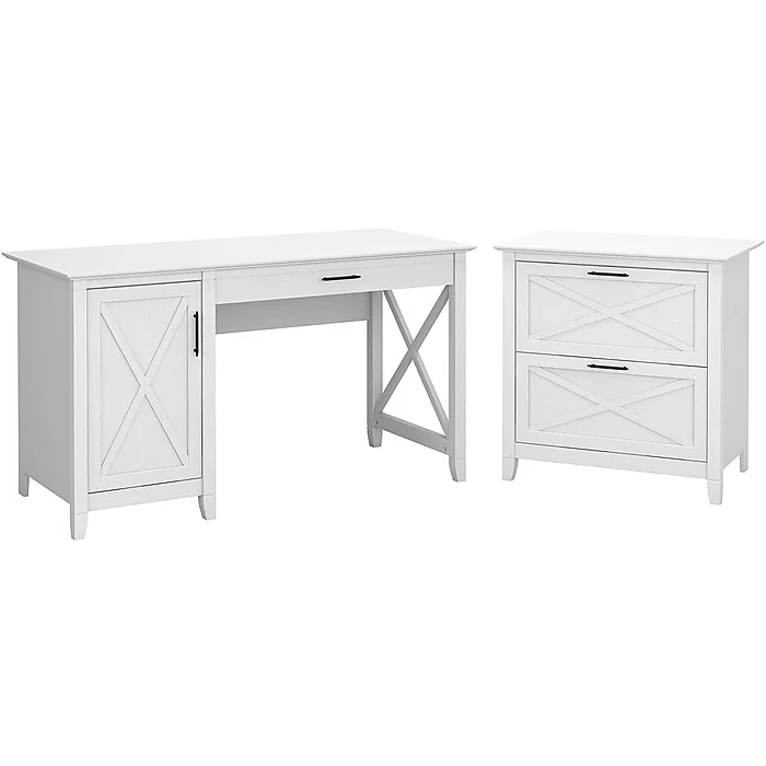 The Bush Furniture Key West 54″W computer desk with storage and two-drawer lateral file cabinet provides a home office furniture set with a casual farmhouse style. It offers a refreshing approach to working in your home. Spread out with a computer, books and paperwork on a durable desktop that boasts a weight capacity of 200 pounds. The convenient top drawer is an ideal place to store your keyboard or laptop and has a flip-down front that folds up neatly when not in use. The desk also includes a built-in storage cabinet with one adjustable shelf to accommodate materials of various sizes. The lateral filing cabinet’s drawers open on smooth full-extension ball-bearing slides for an easy reach to legal- and letter-size documents. Unique X pattern accents create a relaxed feel with a sturdy and attractive post leg design. This office desk set is tested to meet ANSI/SOHO quality standards for safety and performance and is backed by a 1-year warranty.