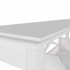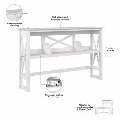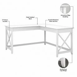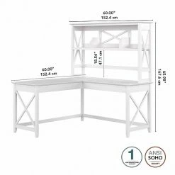 With its practical design and easy-going style, the Bush Furniture Key West 60″W L-shaped desk with hutch offers a perfect workspace solution for home offices. The durable work surface is spacious enough to spread out with a computer, paperwork, and more when taking on your task of the day or just browsing the web. A sturdy post leg design with X-shaped accents on the side panels creates a relaxed, open appearance, while thoughtful construction and quality materials allow the corner desk to support up to 200 lbs. The hutch attaches to whichever side you prefer for convenient access to materials. Its three upper compartments are perfect for storing books and binders, or brightening up your home office with pictures and decorations. The L-shaped computer desk set is tested to meet ANSI/SOHO standards for safety and performance and is backed by 1-year warranty.