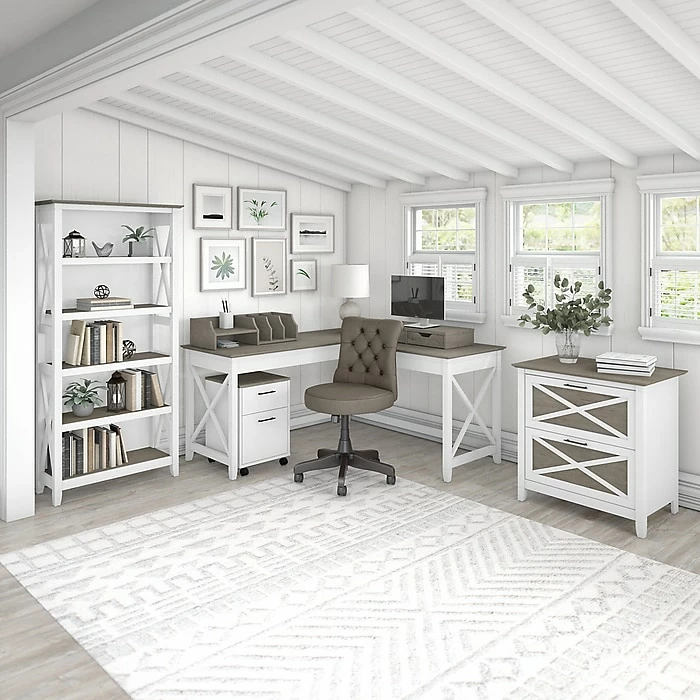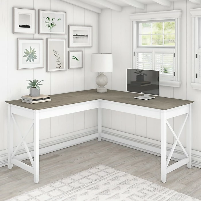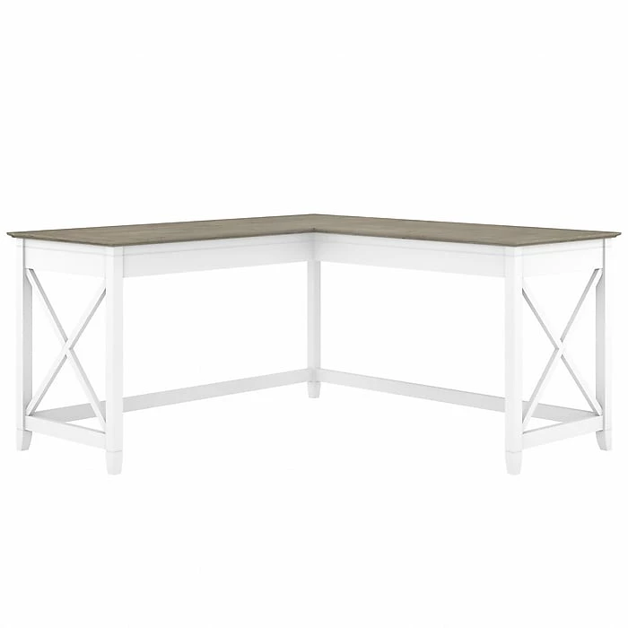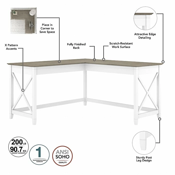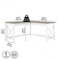With its practical design and easygoing style, the Bush Furniture Key West 60″W L-shaped desk offers a perfect workspace solution for home offices. Save floor space in compact areas by placing the desk in a corner or make use of the fully finished back to take a prominent position in the middle of the room. At 60″W x 60″D, the durable work surface is spacious enough to spread out with a computer, paperwork, and more when taking on your task of the day or just browsing the web. A sturdy post leg design with unique X-pattern accents on the side panels creates a relaxed, open appearance while thoughtful construction and quality materials allow the corner desk to support up to 200 lbs. This L-shaped computer desk is tested to meet ANSI/SOHO quality standards for safety and performance and is backed by a 1-year manufacturer’s warranty. See the full collection for coordinating items available.