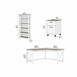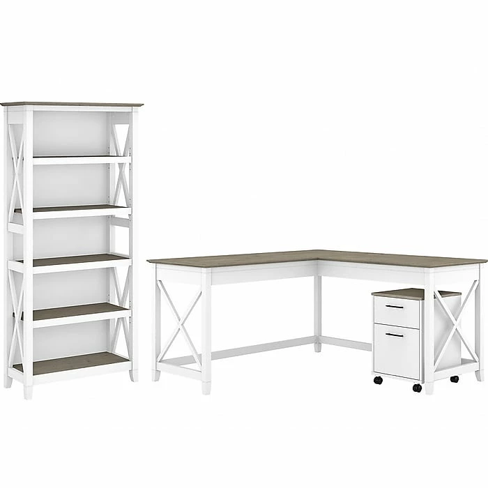 Create a personal workspace with easy going style and plenty of storage for all the materials you need to stay productive. The Bush Furniture Key West 60W L Shaped Desk with Mobile File Cabinet and 5 Shelf Bookcase offers an ideal set up for home and small offices. Save floor space by placing the 60W x 60D Desk in a corner or make use of the fully finished back to take a prominent position in the middle of the room. The 2 drawer filing cabinet fits under the L Desk and has front locking casters for secure placement. The file drawer organizes letter size documents while a box drawer keeps office supplies and utensils close by. The Bookcase features 3 adjustable shelves for flexible storage and display along with 2 fixed shelves for stability. This L shaped computer desk with storage set is tested to meet ANSI/SOHO standards for safety and performance and is backed by a 1 Year Warranty.